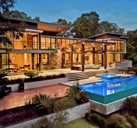 The home with its striking façade built from Coldstream Stone features massive Ironbark posts, spectacular glazing seldom seen before, glossy polished concrete floors, grand spaces and showcasing the best of local and international fixtures and fittings.