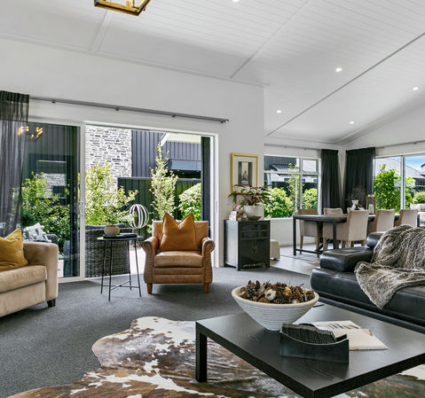 As you enter the home, built in board and batten and accentuated with schist, you are drawn into a large open plan lounge with raked ceilings, complete with a beautiful feature fireplace that has been designed to create comfort and a feeling of opulence.