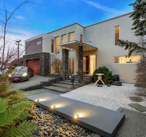 • Sunny spaces with a pronounced minimalism emphasising low maintenance, sound structure, and purity of design • Easy flow to groomed grounds where auspicious Japanese Zen gardens harmonize with screened hedging and high stone walls • An idyllic sake kiosk for outdoor entertaining amidst Kwila decking which surrounds an in-ground spa pool • Contemporary Italian kitchen with sleek granite countertops open to dining and living areas • Ground floor accommodation of two double bedrooms served by a stunning bathroom with separate tub and shower • A substantial 68 sqm (approx.) home business base potentially repurposed as more upstairs bedrooms and living spaces • Stunning 80 square meter Master suite with a large walk in dressing room and tiled ensuite with dual shower fittings for two to shower together • State of the art Smartphone connected home security system comprising gate intercom, Wi-fi cameras, alarm, keyless entry, intuitive lighting, and motion sensors • A fully carpeted garage for one vehicle and secure off-street parking for two more