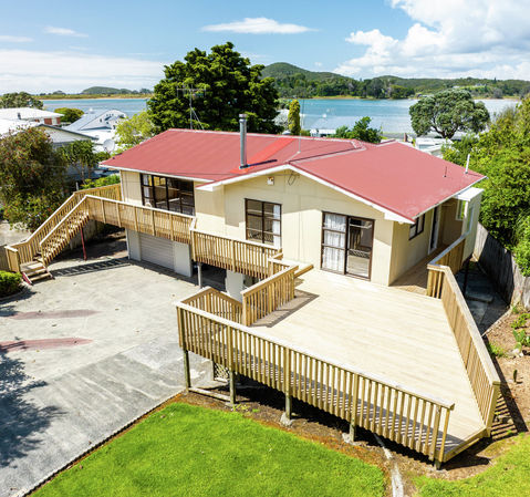 The upstairs gives large areas: lounge, dining, and kitchen space have views of the estuary and multiple egresses to a super-sized deck facing north for all-day sun. The 921 sqm section size is bigger than normal for Ngunguru and gives plenty of space for fruit trees, gardens, and summertime campers around the brick barbeque.