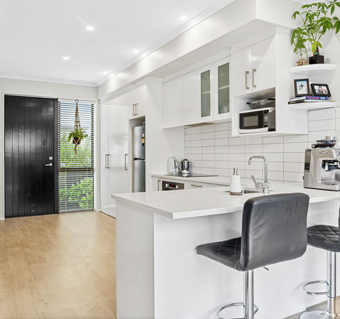 The downstairs layout is open and inviting, with a well appointed kitchen, breakfast bar, ample storage and hidden laundry. The sun drenched living room flows through to an entertaining patio- ideal for barbeques. The section is sizeable enough for a play area for children, while still being quick to maintain.