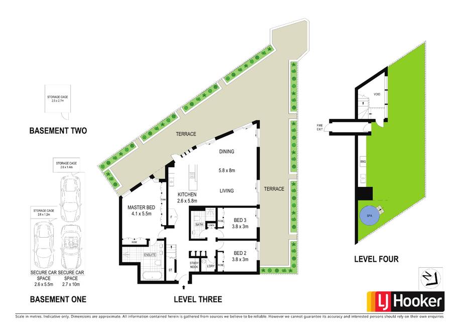 • Lift access to three secure car spaces, three storage cages