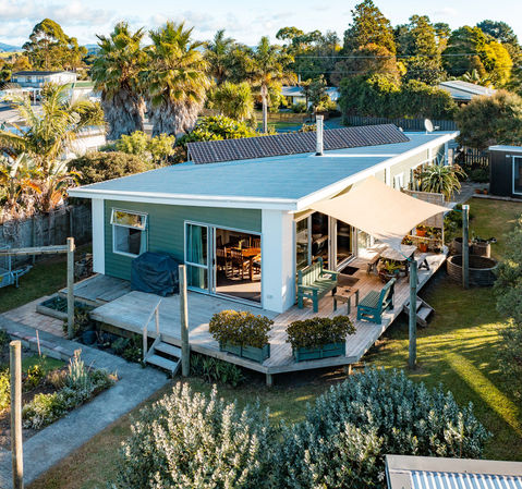 Pull back the ranch sliders and the open plan lounge, dining area connect seamlessly to the sunny outside via wrap-around decks. The huge 813 sqm site is a sun lover's dream, a natural sun trap, the lush fruiting citrus trees testimony to that. The feijoas rapidly ripening, getting juicer by the day. Equipped with solar panels all that sun will make your wallet juicer too!