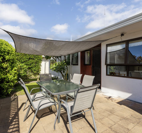 Private outdoor patio complete with shade sail, fully fenced easy care established gardens and off street parking for up to two vehicles with integral access.