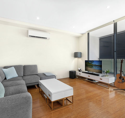 Air conditioning, polished timber floorboards, neutral tones