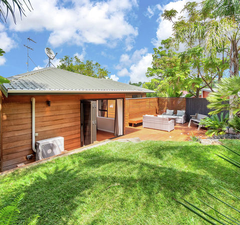 The open plan lounge, dining and kitchen has warm solid-wood flooring throughout and is fitted with a heat pump to ensure your year-round comfort. The sunny kitchen is sleek and modern, with stone benchtops and lovely garden views. From both the lounge and dining areas there is access to the deck and gardens. This outdoor area is private, lush and beautifully landscaped, creating the perfect tropical-inspired retreat for you to sit back and relax or entertain guests. Being fully fenced, it also offers a wonderful space for young ones to enjoy the outdoors. There is double garaging with internal access, and off-street parking available too.