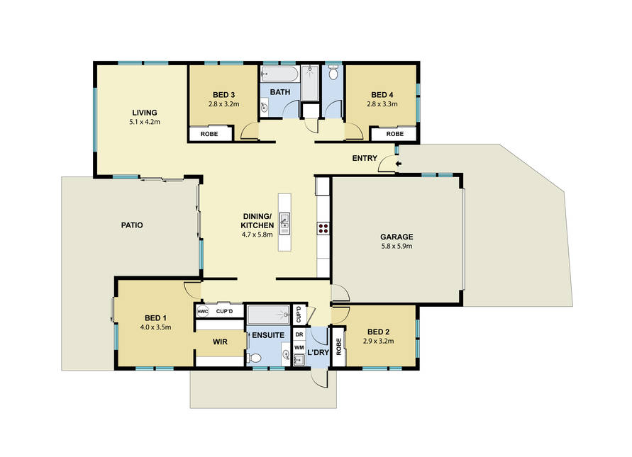 The galley kitchen is the centrepiece, with a long island and is well equipped, adding to the seamless social space. Two wings - each side offering two bedrooms, providing excellent privacy and separation.