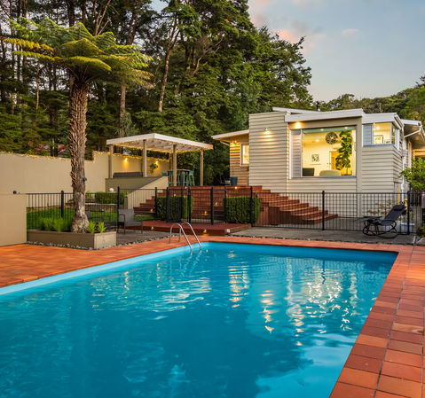 Located on a sunny elevated site in Silverstream's premiere street Chatsworth road, number 41 is a dream home. Reflecting its 1960s roots and with vibes of California-meets-Kiwi lifestyle, this light filled home has a modern feel with superb kitchen and indoor-outdoor flow, enhanced by an ideal orientation for entertaining, with its afternoon-sun drenched decks, pool and garden.