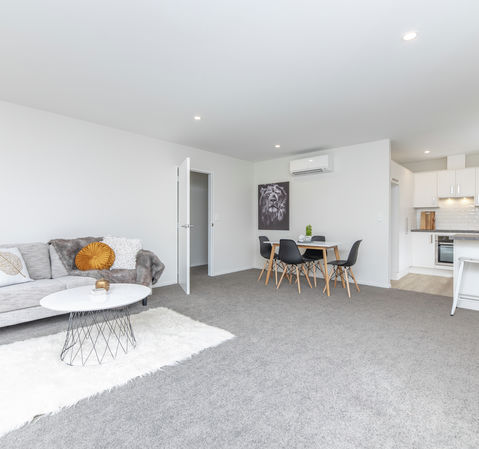 The spacious living area is open plan with the kitchen and dining space. Sliding doors give you access to the fully fenced and private compact lawn area.