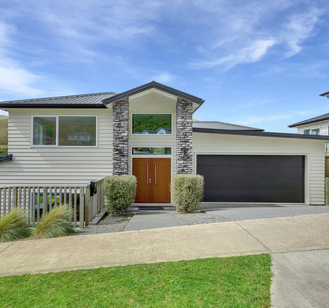 Casting a contemporary street aesthetic in modern material weatherboard with schist columned entrance with easy drive on access to internal double garage.
