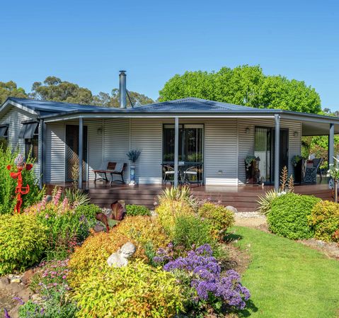 This delightful north-facing home offers picturesque views of the surrounding countryside. The light-filled open-plan living area is perfect for family gatherings and entertaining, with a wide wrap-around verandah adding to the charm. The tranquil bedrooms are fitted with built-in robes and ceiling fans, ensuring comfort for the entire family. The master suite, which includes a walk-in robe and luxurious ensuite, serves as a private retreat.