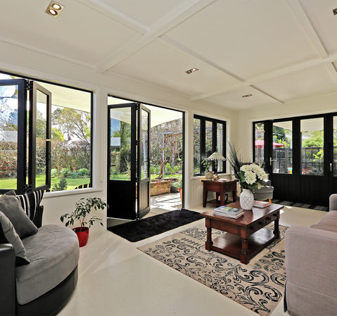 Floor to ceiling internal windows create architectural sophistication & allow the eyes to span the restful & tastefully designed sunroom extension with stacker doors & painted floorboards leading to a delightful private garden hideaway.