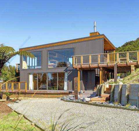 Rich in natural textures incorporating exposed timber panelling, ceilings and trims complemented by a rustic yet modern timber topped kitchen, Rimu flooring, open plan living heated by a wood burner, designer lighting and generous elevated decking ideal for hosting or sun-soaking.