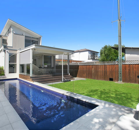 Alfresco entertaining area with a swimming pool & level lawn