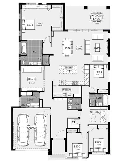 At the heart of the home, the open-plan kitchen, dining, and living area exudes elegance, featuring a striking 1200mm waterfall island bench, an integrated range hood above the Electrolux 5-burner gas cooktop, and a double steam-bake Electrolux oven. A Westinghouse dishwasher and a well-thought-out storage system ensure a seamless cooking experience, while the butler's pantry-with a fridge recess, additional sink, and extra storage-adds to the home's practicality.