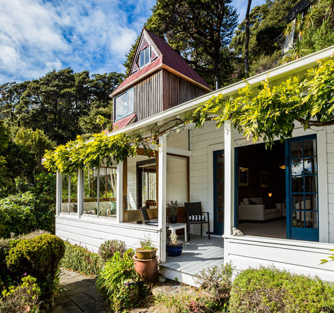 Nestled in a coveted Days Bay position, this unique architecturally designed home blends cottage warmth with retro '70s flair. A charming cottage garden sets the scene, leading to a welcoming interior of native timber tongue-and-groove panelling. Sun streams into the dining area and sheltered wisteria framed porch, creating the perfect spot to relax while listening to birdsong.